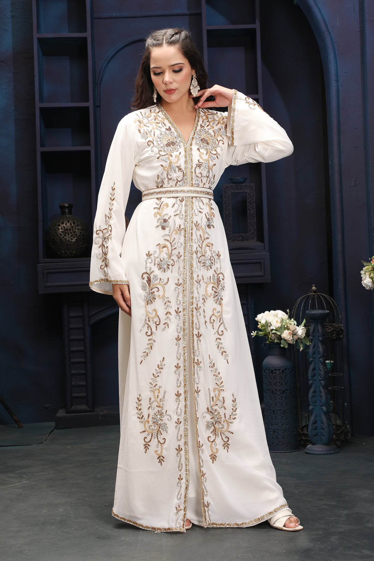 Modest Off-White Kaftan Dress with Premium Gold Embellishments |