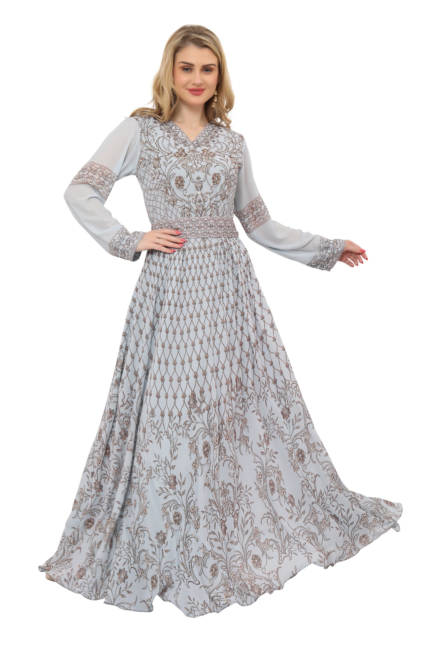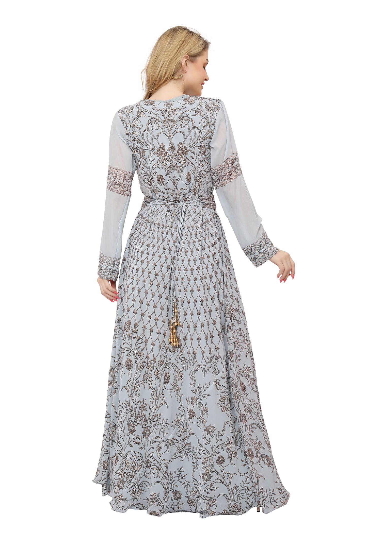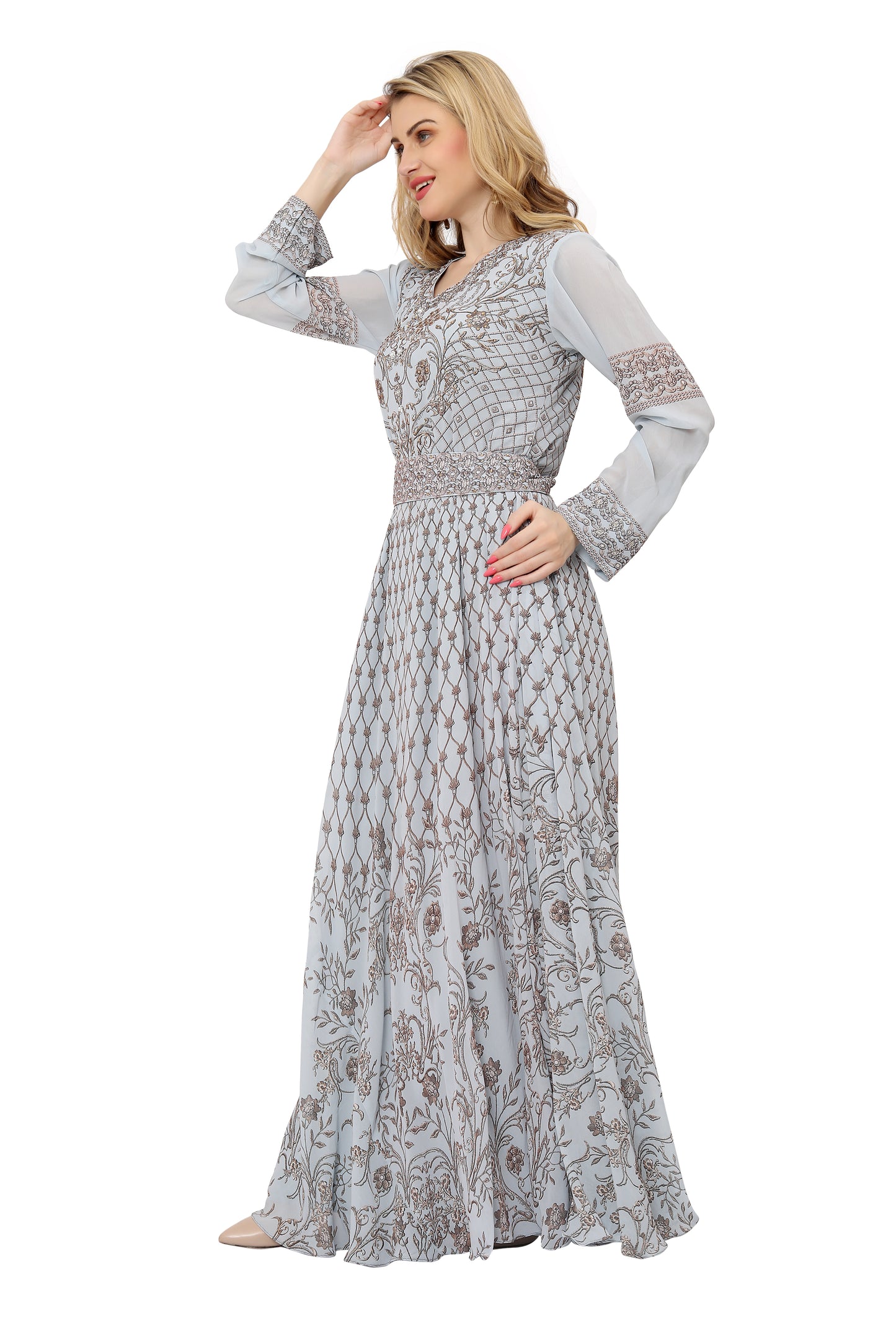 Grey Digital Print Kaftan Henna Party Dress with Crystals