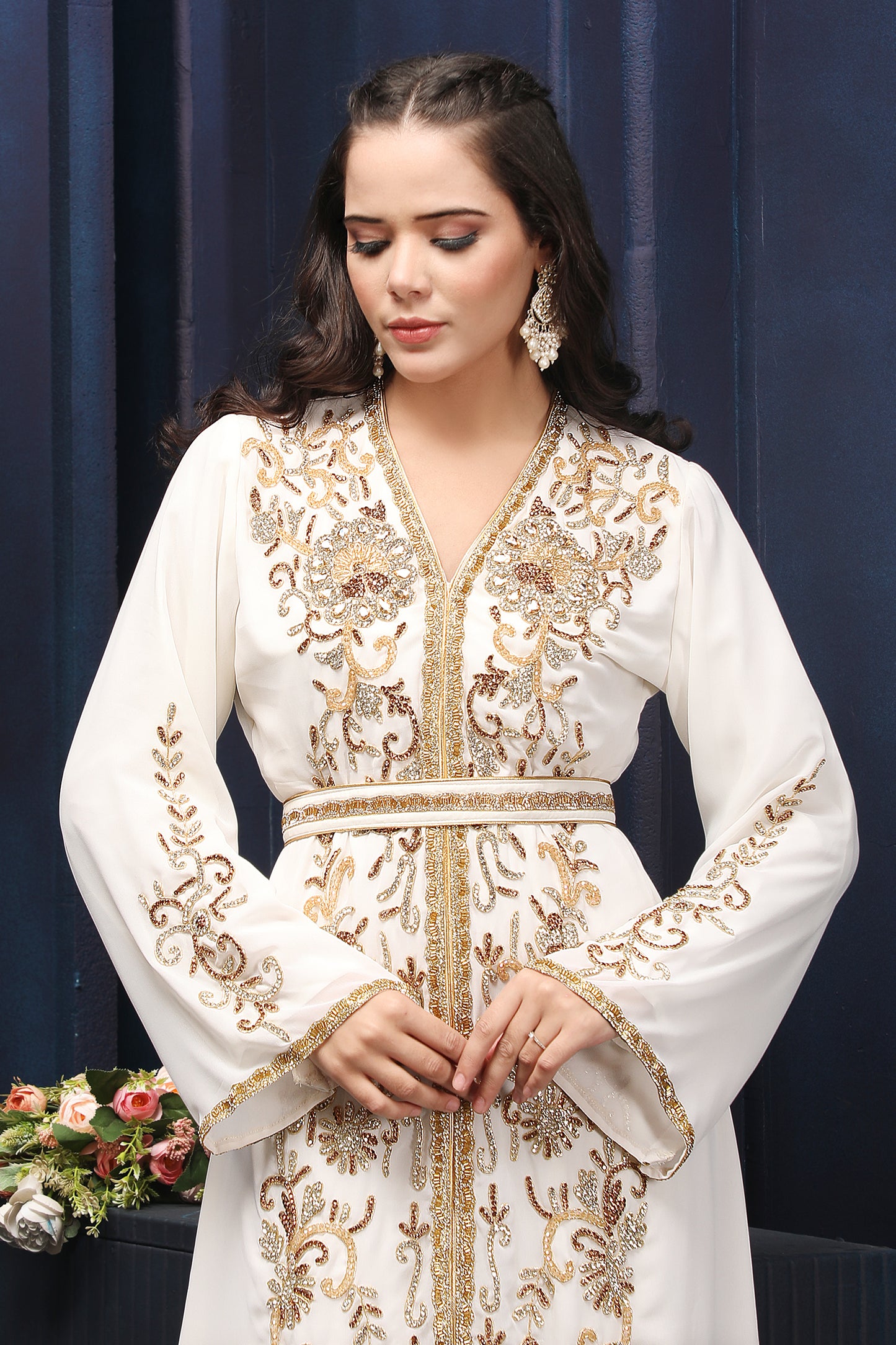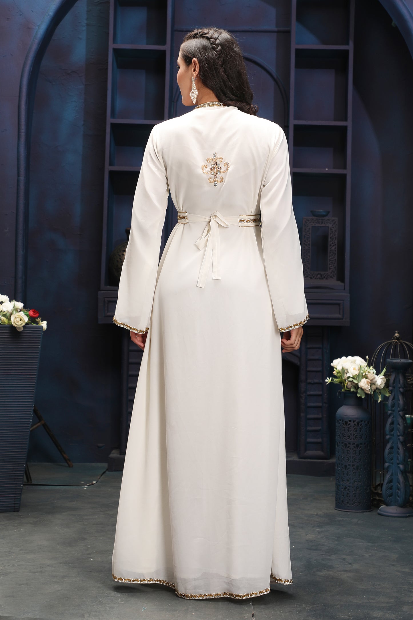 Modest Off-White Kaftan Dress with Premium Gold Embellishments |